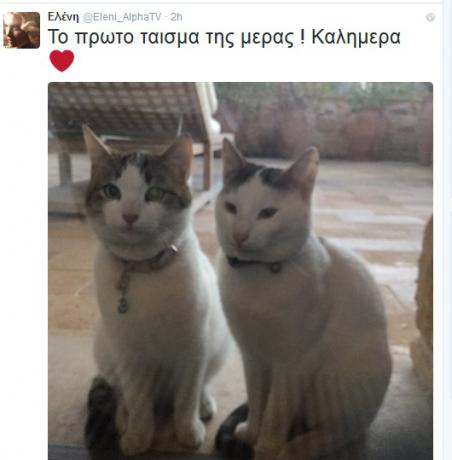 «Το πρώτο τάισμα της ημέρας! Καλημέρα», έγραψε η παρουσιάστρια και ανέβασε στο Twitter μια φωτογραφία με δύο μικρά γατάκια.