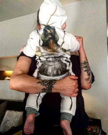 Σήμερα λοιπόν, η Ρούλα Ρέβη δημοσίευσε μια φωτογραφία με το ένα της παιδάκι, όπου φορούσε ένα φορμάκι με την πίσω όψη του να μοιάζει με ζωάκι..