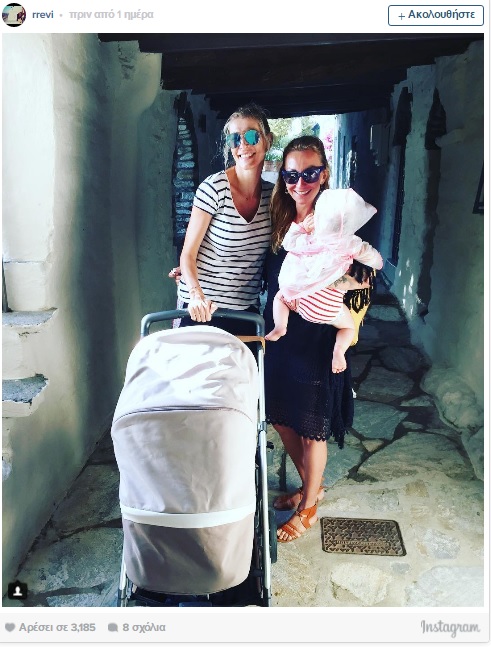 Τα ζευγάρια συναντήθηκαν στο νησί της Μεγαλόχαρης και φυσικά δεν θα μπορούσαν να μη πάρουν τα παιδάκια τους και να κάνουν βόλτα, απολαμβάνοντας τις ομορφιές του νησιού. Τόσο η Ζέτα Δούκα, όσο και η Ρούλα Ρέβη πήραν τα κοριτσάκια τους και τα καροτσάκια τους και έβγαλαν μία πανέμορφη φωτογραφία οι τέσσερις τους σε ένα γραφικό στενάκι.