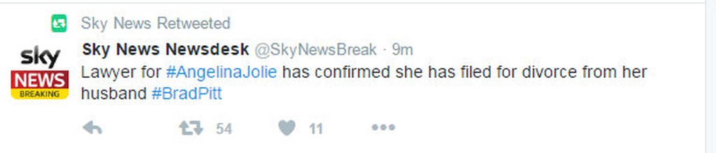 Την επιβεβαίωση του διαζυγίου από τον δικηγόρο της Angelina Jolie έκανε το sky news με ένα tweet.