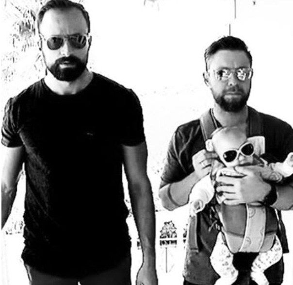 Ο τραγουδιστής πόζαρε στον φωτογραφικό φακό με τον στενό του φίλο και συνεργάτη, Γιώργο Λιάνο έχοντας την μικρή στο μάρσιπο και έκλεψαν την παράσταση.