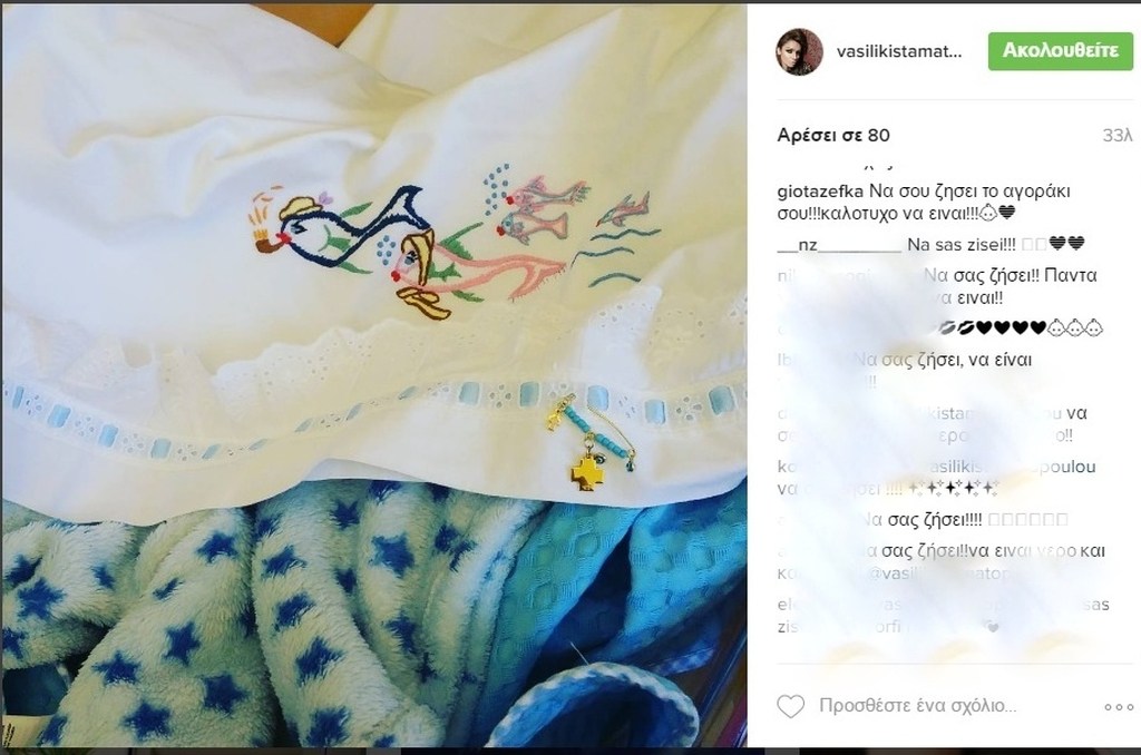Την αποκάλυψη έκανε η σύζυγος του μοντέλου μέσω του προσωπικού της λογαριασμού στο Instagram όταν ανέβασε μια φωτογραφία με κουβερτάκια και έγραψε «it’s a boy».