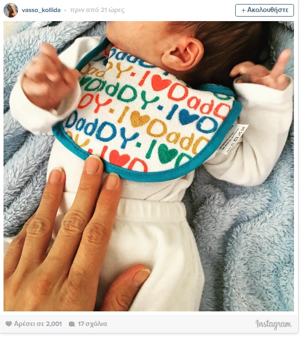 Το απόγευμα της Δευτέρας, ανήρτησε στον προσωπικό της λογαριασμό στο instagram, την πρώτη φωτογραφία της κόρης της, φορώντας μια σαλιάρα που έγραφε i love daddy. Η Βάσω έχει ακόμη ένα παιδί, τον Γιώργο.