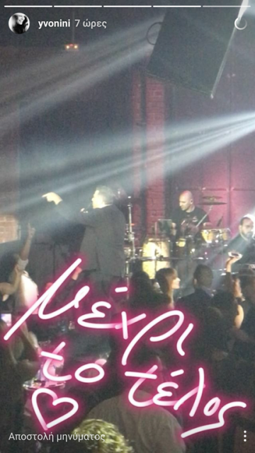 Το βράδυ του Σαββάτου η Υβόννη διασκέδασε στο νυχτερινό κέντρο που εμφανίζεται ο σύντροφός της και όταν εκείνος ερμήνευε το κομμάτι «Μέχρι το τέλος του κόσμου» εκείνη τραβούσε βίντεο και έγραφε πως θα τον αγαπάει μέχρι το τέλος του κόσμου.