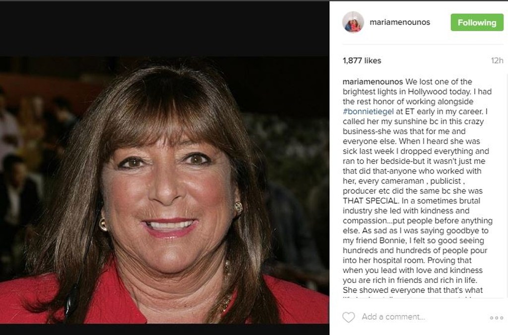 Η Μαρία Μενούνος έγραψε ένα συγκινητικό μήνυμα στο Instagram: «Σήμερα χάσαμε ένα από τα πιο φωτεινά αστέρια του Hollywood. Είχα την τιμή να δουλέψω στο πλάι της Bonnie Tiegel στο ET κατά τη διάρκεια της καριέρας μου. Τη φώναζα “λιακάδα μου”, επειδή στην τρελή δουλειά που κάνω ήταν αυτό ακριβώς τόσο για εμένα όσο και για τους υπόλοιπους. Όταν άκουσα ότι ήταν βαριά άρρωστη την προηγούμενη εβδομάδα, άφησα τα πάντα και έτρεξα δίπλα της. Όμως δεν ήμουν μόνο εγώ. Όλοι όσοι έχουν δουλέψει μαζί της, κάθε cameraman , δημοσιογράφος, παραγωγός κτλ έκανε ακριβώς το ίδιο γιατί ήταν τόσο σημαντική... Όσο λυπημένη ήμουν λέγοντας αντίο στη φίλη μου Bonnie, ένιωσα τόσο καλά που έβλεπα τόσους ανθρώπους να μπαίνουν στο δωμάτιό της στο νοσοκομείο. Αυτό απέδειξε πως όταν προχωράς με αγάπη και ευγένεια είσαι πλούσιος σε φίλους και εξίσου πλούσιος στη ζωή. Έδειξε σε όλους μας πως αυτός είναι ο σκοπός της ζωής. Ξεπέρασα πως ο καρκίνος παίρνει τους καλούς ανθρώπους. Σε αυτή την περίπτωση έδειξε τον τρόπο που πρέπει να περάσουμε τον χρόνο μας όσο είμαστε ζωντανοί ή μάλλον το πώς μπορούμε αν επιλέξουμε αυτόν τον τρόπο. Σε αγαπώ Bonnie RIP».