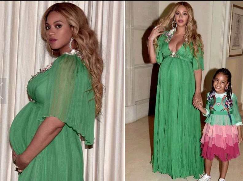 Φορώντας μια πράσινη τουαλέτα που τόνιζε το μπούστο της και πανάκριβα κοσμήματα η διάσημη τραγουδίστρια ποζάρει στο φακό με την πολύ φουσκωμένη της κοιλίτσα και κάνει γκριμάτσες παρέα με την κόρη της.
