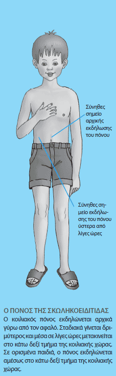 • Στην περίπτωση της σκωληκοειδίτιδας, ο πόνος εκδηλώνεται αρχικά γύρω από τον αφαλό και μετακινείται στο κάτω δεξί τμήμα της κοιλιακής χώρας. Ο πόνος είναι διαξιφιστικός και σταθερός, ενώ επιδεινώνεται όσο περνάει η ώρα. Οποιαδήποτε κίνηση –βήχας, άλμα ή πίεση στην ερεθισμένη περιοχή– είναι συνήθως ιδιαίτερα επώδυνη. Το παιδί συχνά εμφανίζει πυρετό (αν και όχι ιδιαίτερα υψηλό), ανορεξία και ναυτία, ενώ μπορεί να κάνει και εμετούς. Είναι ένα πρόβλημα που προκύπτει σπάνια στα πρώτα χρόνια της ζωής.
