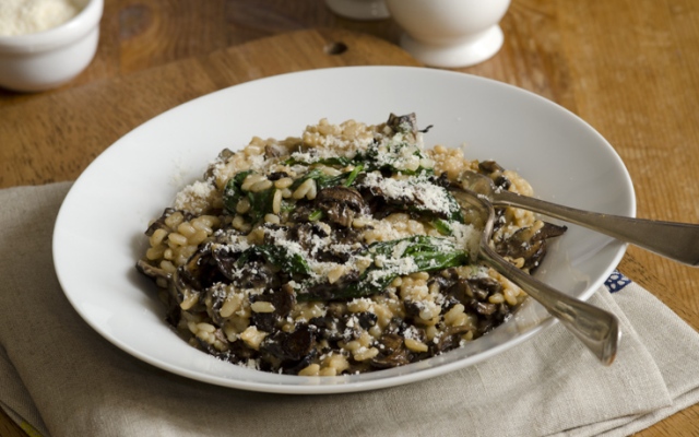 Ριζότο με σπανάκι και μανιτάρια, με κρεμώδη υφή και γεμάτη γεύση. Δείτε αναλυτικά τη συνταγή! Υλικά για 2 άτομα