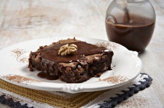 Σοκολατόπιτα με καρύδια και επικάλυψη σάλτσας σοκολάτας