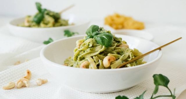 Μακαρόνια με σάλτσα πέστο, κάσιους και βασιλικό