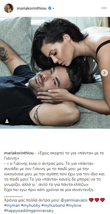 Η Μαρία Κορινθίου και ο Γιάννης Αϊβάζης παντρεύτηκαν στις 12 Σεπτεμβρίου του 2010 στο εκκλησάκι του Αγίου Νικολάου στην Ανάβυσσο. Το ζευγάρι έπειτα από 9 χρόνια γάμου δηλώνει ακόμα ερωτευμένο και δε διστάζει να το δείξει. Χθες, οι δύο ηθοποιοί έχουν την επέτειο του γάμου τους και έτσι η Μαρία Κορινθίου έκανε μια ανάρτηση στον προσωπικό της λογαριασμό στο Instagram, όπου έγραψε χαρακτηριστικά: "Έχεις σκεφτεί το για πάντα με το Γιάννη; Ο Γιάννης είναι ο άντρας μου. Το για πάντα συνάδει με τον Γιάννη, με το παιδί μου, με την οικογένειά μου, με την αγάπη που έχω για τον ίδιο και το παιδί μου! Το για πάντα κανείς δε μπορεί να το γνωρίζει, αλλά γι’ αυτό το για πάντα ελπίζω είχα πει εγώ πριν κάτι χρόνια σε μια συνέντευξη. Χρόνια μας πολλά άντρα μου!» .jpg)