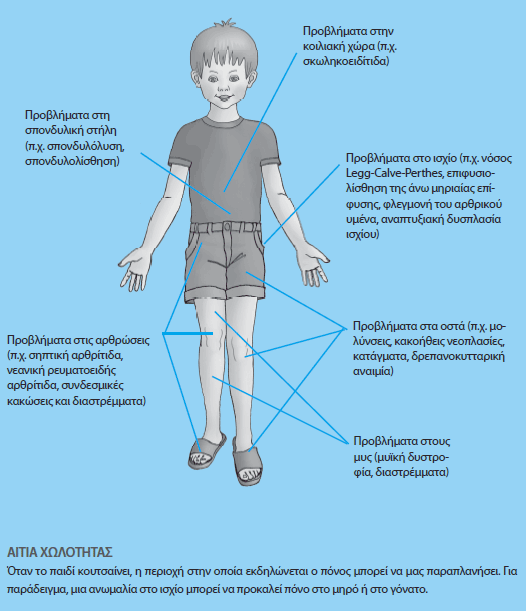 Τα προβλήματα στη σπονδυλική στήλη (π.χ. σπονδυλόλυση, σπονδυλολίσθηση) και τα προβλήματα στην κοιλιακή χώρα (π.χ. σκωληκοειδίτιδα) μπορεί επίσης να προκαλέσουν χωλότητα. Τα παιδιά με δρεπανοκυτταρική αναιμία μπορεί να προσκομιστούν στο γιατρό εξαιτίας μιας κρίσης στα οστά, η οποία προκαλεί πόνο και άρνηση άρσης οποιουδήποτε βάρους. Τα δάχτυλα των ποδιών ή των χεριών μπορεί να πρηστούν – κι αυτή μπορεί να είναι η πρώτη ένδειξη μιας υπάρχουσας πάθησης την οποία οι γονείς αγνοούσαν.