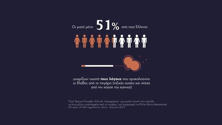Έλλειψη ενημέρωσης φαίνεται να έχει η κοινή γνώμη και ειδικότερα οι καπνιστές για τους λόγους που το τσιγάρο είναι επιβλαβές για την υγεία, καθώς και για τις διαφορές που έχει από τα εναλλακτικά του καπνίσματος προϊόντα. Τα συμπεράσματα αυτά προκύπτουν από τη νέα διεθνή έρευνα της ανεξάρτητης εταιρείας Povaddo που έγινε για λογαριασμό της Philip Morris International με τη συμμετοχή 29.484 ενηλίκων από 26 χώρες, μεταξύ των οποίων και η Ελλάδα.