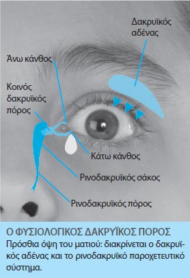 Τα δάκρυα παράγονται συνεχώς σε μικρούς αδένες, οι οποίοι βρίσκονται στο άνω εξωτερικό τμήμα κάθε βλεφάρου. Αφού λιπάνουν το μάτι, κυλούν προς τις μικρές οπές που βρίσκονται στη ρινική πλευρά του βλεφάρου. Αυτές οι οπές είναι το σημείο εισόδου ενός πολύπλοκου παροχετευτικού συστήματος, μέσα από το οποίο τα δάκρυα περνούν στο οπίσθιο τμήμα της μύτης (γεγονός που εξηγεί τη ρινική συμφόρηση μετά το κλάμα). Σε ορισμένα βρέφη, ο ρινοδακρυϊκός πόρος (βλ. διπλανή φωτογραφία) αποφράσσεται εν μέρει ή πλήρως, προκαλώντας δακρύρροια. Τα συμπτώματα συχνά εκδηλώνονται πολλές εβδομάδες μετά τον τοκετό, καθώς το βρέφος παράγει πλέον περισσότερα δάκρυα. Τι είναι η απόφραξη του δακρυϊκού πόρου;