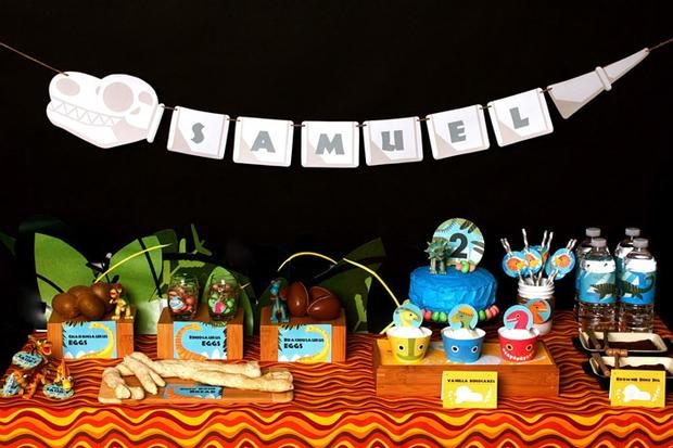 Δεινόσαυροι! Αρέσει πολύ στα αγόρια. Η γιρλάντα της φωτογραφίας είναι πανέξυπνη! Και η τούρτα πανεύκολη ειδικά αυτή την εποχή, που υπάρχουν πολλά αυγουλάκια πολύχρωμα στην αγορά! Τα χρώματά σας είναι πλέον καφέ και πράσινο.