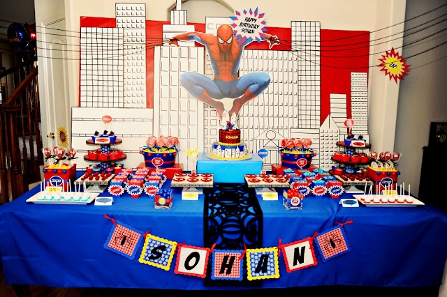 Παρέα με τον Spiderman. Το πάρτι της φωτογραφίας είναι υπερπαραγωγή! Ωστόσο μπορούμε να πάρουμε κάποια στοιχεία. Επίσης στο ίντερνετ υπάρχουν παρά πολλά σχέδια του συγκεκριμένου υπερήρωα που τυπώνονται και με αυτά στολίζουμε τον χώρο μας αλλά και τα γλυκάκια μας. Κόκκινο και μπλε τα χρώματά μας!