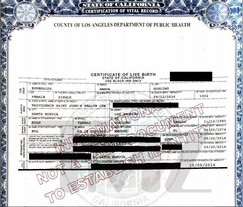 Το ζευγάρι αποφάσισε να δώσει στην νεογέννητη κόρη του το όνομα Εσμεράλντα Αμάντα Γκόσλινγκ η οποία γεννήθηκε τον περασμένο μήνα στο νοσοκομείο Saint John's Health Center στη Σάντα Μόνικα της Καλιφόρνιας, όπως θα δείτε και στο πιστοποιητικό της γέννησης της, το οποίο βγήκε στη δημοσιότητα.