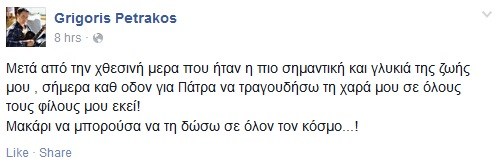 «Μετά από την χθεσινή μέρα που ήταν η πιο σημαντική και γλυκιά της ζωής μου , σήμερα καθοδόν για Πάτρα να τραγουδήσω τη χαρά μου σε όλους τους φίλους μου εκεί! Μακάρι να μπορούσα να τη δώσω σε όλον τον κόσμο…!».