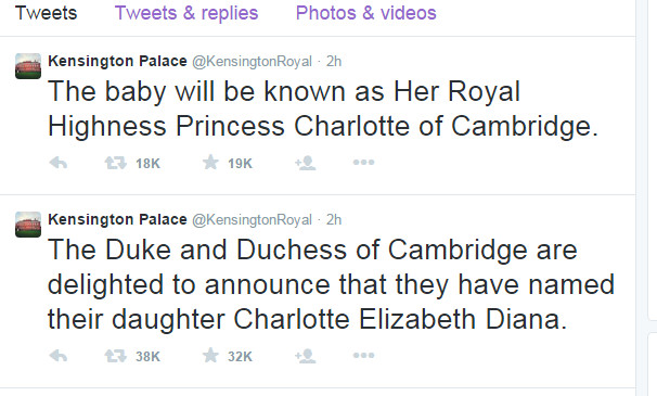 Με ένα λιτό tweet 19 λέξεων, το Παλάτι έδωσε στην δημοσιότητα το όνομα που θα φέρει από δω και μπρος το δεύτερο παιδί της Δούκισσας Κέιτ και του Πρίγκιπα Ουίλιαμ.