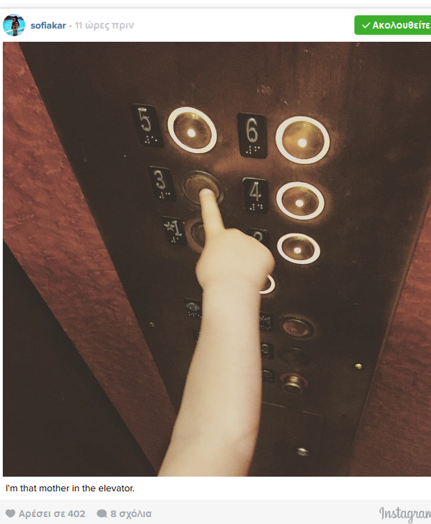 Η Σοφία συνόδευσε τη φωτογραφία με τη λεζάντα «Είμαι αυτή η μαμά στο ασανσέρ»