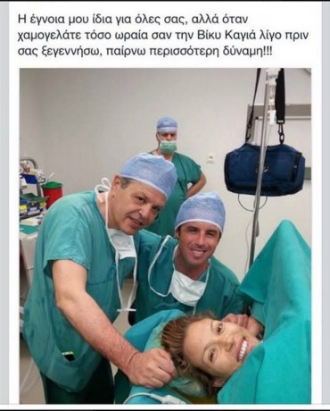 Η Βίκυ Καγιά γέννησε με καισαρική τομή και ο μαιευτήρας της απαθανάτισε φωτογραφικά τη στιγμή και τη δημοσίευσε στα social media, γράφοντας: «Η έγνοια μου ίδια για όλες εσάς, αλλά όταν χαμογελάτε τόσο ωραία σαν τη Βίκυ Καγιά λίγο πριν σας ξεγεννήσω, παίρνω περισσότερη δύναμη!!!.»