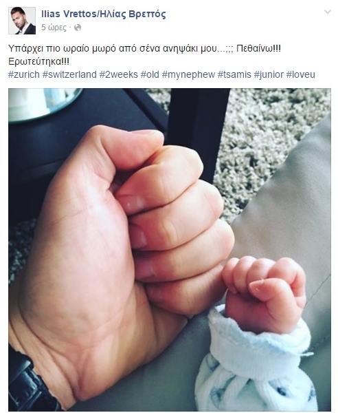 «Υπάρχει πιο ωραίο μωρό από σένα ανηψάκι μου...;;; Πεθαίνω!!! Ερωτεύτηκα!!!», έγραψε ο τραγουδιστής στα social media, δημοσιεύοντας φωτογραφία που δείχνει το χέρι του δίπλα σε εκείνο του μωρού.