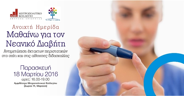 Το Τμήμα Διαιτολογίας της Σχολής Υγείας του Μητροπολιτικού Κολλεγίου και η ΜΚΟ «Με Οδηγό το Διαβήτη-Κάρτα Διαβήτη» συνδιοργανώνουν την Παρασκευή 18 Μαρτίου 2016 και ώρες 16:00-19:00 ανοιχτή ημερίδα με θέμα «Μαθαίνω για τον Νεανικό Διαβήτη–Αντιμετώπιση έκτακτων περιστατικών στο σπίτι και στις αίθουσες διδασκαλίας», με ελεύθερη είσοδο.
