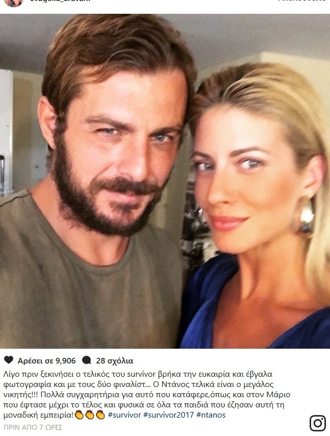 «Λίγο πριν ξεκινήσει ο τελικός του survivor βρήκα την ευκαιρία και έβγαλα φωτογραφία και με τους δύο φιναλίστ…Ο Ντάνος τελικά είναι ο μεγάλος νικητής!!! Πολλά συγχαρητήρια για αυτό που κατάφερε, όπως και στον Μάριο που έφτασε μέχρι το τέλος και φυσικά σε όλα τα παιδιά που έζησαν αυτή τη μοναδική εμπειρία!👏👏👏 #survivor #survivor2017 #ntanos» έγραψε η Ευαγγελία Αραβανή ποζάροντας μαζί με τον Γιώργο Αγγελόπουλο.