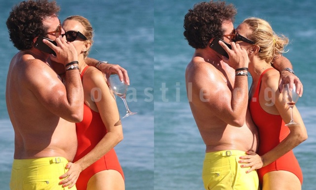 Ο φωτογραφικός φακός του govastileto.gr απαθανάτισε το ερωτευμένο ζευγάρι σε κοσμική παραλία του νησιού να απολαμβάνει τις βουτιές του αγκαλιά ανταλλάζοντας καυτά φιλιά στο στόμα.