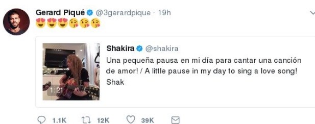 Ο Gerard Pique αναδημοσίευσε ένα βίντεο από τον λογαριασμό της τραγουδίστριας, στο οποίο εκείνη ερμηνεύει παίζοντας κιθάρα ένα τραγούδι αγάπης. Ο ποδοσφαιριστής άφησε τα emoji «να μιλήσουν» για εκείνον, στέλνοντας φιλιά και βλέποντας καρδούλες για την αγαπημένη του.
