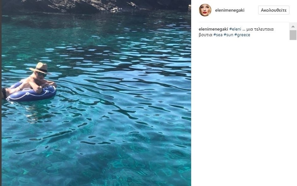 Η παρουσιάστρια μάλιστα δεν δίστασε να βάλει το μαγιό της και να κάνει το τελευταίο της μπάνιο στα Άχλα της Άνδρου. Φορώντας μαύρο μπικίνι, η Ελένη πόζαρε πάνω σε στρώμα κι «ανέβασε» τη φωτογραφία στο Ιnstagram με λεζάντα: «#eleni ... μια τελευταία βουτιά #sea #sun #greece».