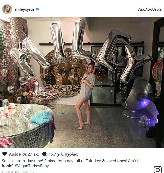 Η Cyrus που γιόρτασε τα γενέθλια της και διαδικτυακά, ανέβασε μία φωτογραφία στο Instagram στην οποία φαίνεται η ελαφρώς φουσκωμένη κοιλιά της.
