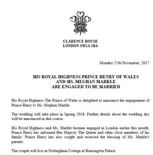 Στη δήλωση ο Harry ανακοινώνει ακόμη ότι έχει ενημερώσει τη βασίλισσα της Αγγλίας Ελισάβετ Β’ όπως και ότι έχει λάβει την ευλογία των γονέων της μέλλουσας νύφης.