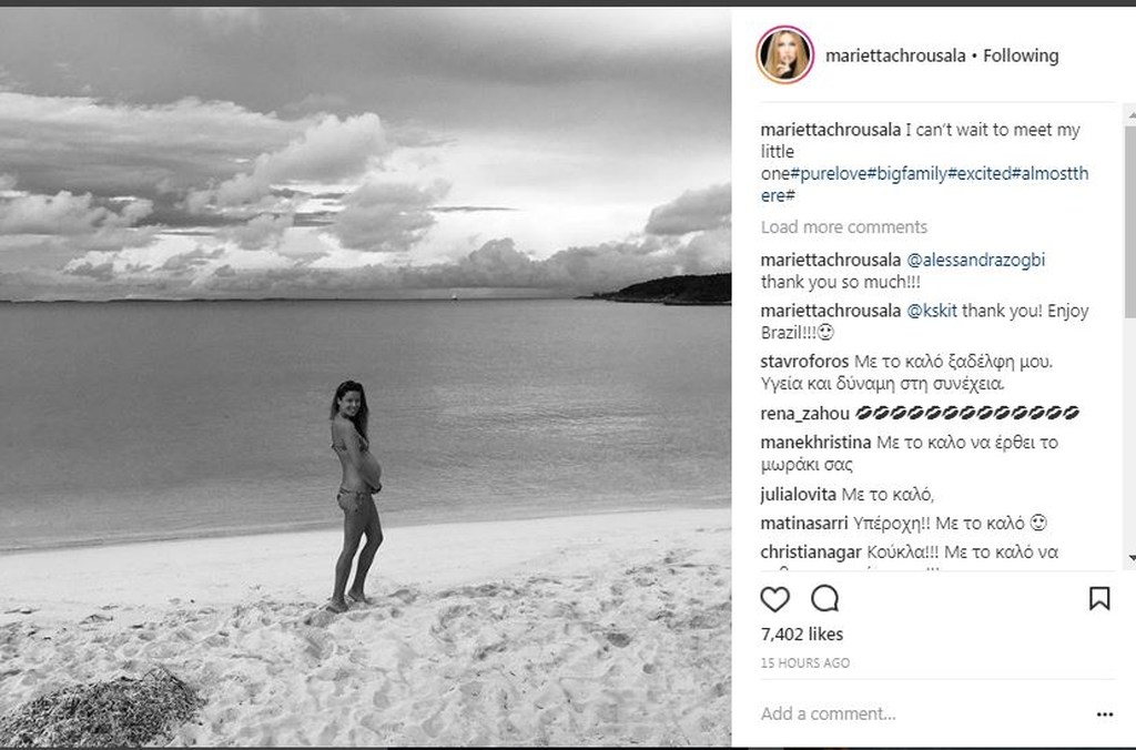 Αυτή τη φορά η Μαριέττα δημοσίευσε μία τρυφερή φωτογραφία της με μπικίνι δίπλα στη θάλασσα και την βλέπουμε να κρατά με τα δυο χέρια της την κοιλιά της και έγραψε στη λεζάντα ότι ανυπομονεί να συναντήσει τον μονάκριβό της και να μεγαλώσει κι άλλο η οικογένειά της. «I can’t wait to meet my little one#purelove#bigfamily#excited#almostthere#»!