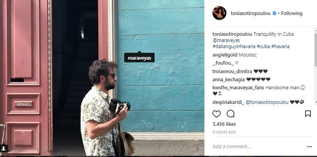 Η Τόνια Σωτηροπούλου και ο Κωστής Μαραβέγιας είναι ερωτευμένοι και δεν το κρύβουν. Εδώ και λίγα εικοσιτετράωρα το ζευγάρι βρίσκεται στην Κούβα μαζί με τον φίλο του, Μάνο Γαβρά και μέσω των social media αναρτούν όμορφα στιγμιότυπα από το ταξίδι τους. Η ηθοποιός μάλιστα φωτογράφισε τον αγαπημένο της και δημοσίευσε την εν λόγω φωτογραφία στο Ιnstagram, γράφοντας: «Tranquility in Cuba @maraveyas #italianguyinhavana #cuba #havana»!