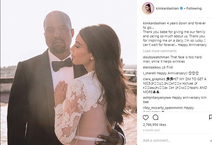 H Kim Kardashian με αφορμή την επέτειο του γάμου της με τον Kanye West, έδωσε τέλος στις φήμες περί χωρισμού που κυκλοφόρησαν το τελευταίο διάστημα! Συγκεκριμένα η 37χρονη τηλεπερσόνα δημοσίευσε μια φωτογραφία στο Instagram από τον γάμο τους στη Φλωρεντία κι έγραψε στη λεζάντα: «Μετράμε τέσσερα χρόνια και είμαστε έτοιμοι για το για πάντα… Σ’ ευχαριστώ μωρό μου για την υπέροχη οικογένεια που μου χάρισες και που νοιάζεσαι τόσο πολύ για μας. Σ’ ευχαριστώ που με εμπνέεις καθημερινά. Είμαι τόσο τυχερή. Ανυπομονώ για το "για πάντα". Ευτυχισμένη επέτειος.», έγραψε χαρακτηριστικά.