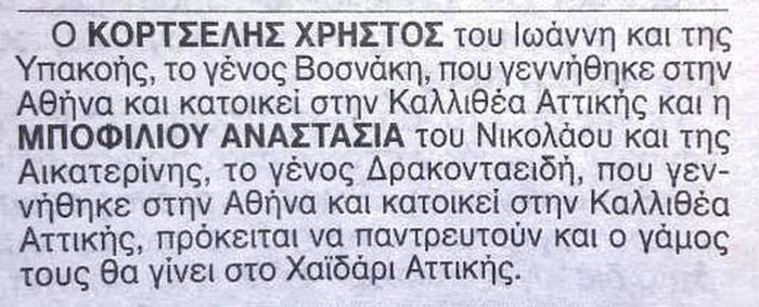Ο γάμος τους θα γίνει, σύμφωνα με την αναγγελία που έχει ήδη δημοσιευθεί σε ημερήσια πολιτική εφημερίδα, στο Χαϊδάρι.