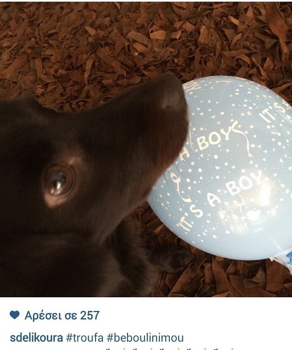 Η όμορφη μανούλα πόσταρε στον προσωπικό της λογαριασμό στο Instagram μία φωτογραφία με τον σκύλο της που αγαπάει πολύ και τον ονομάζει «τρούφα» να κρατάει στο στόμα του το γαλάζιο μπαλόνι που γράφει «it's a boy».