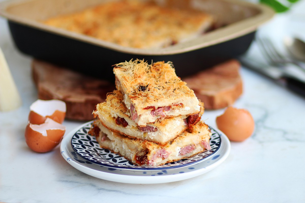 Χωριάτικο λουκάνικο και τυριά παντρεύονται σε μια απολαυστική πίτα σουφλέ από κανταΐφι. Μια συνταγή που χρειάζεται λιγότερο από 10 λεπτά να την φτιάξεις και περίπου 2 ώρες για να δέσει στο ψυγείο και έπειτα να ψηθεί στο φούρνο.
