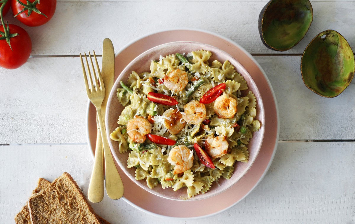 Μια σούπερ συνταγή για ζυμαρικά με γαρίδες, τέλεια σεταρισμένα με μια πεντανόστιμη και πανεύκολη σάλτσα με κύριο συστατικό το αβοκάντο.