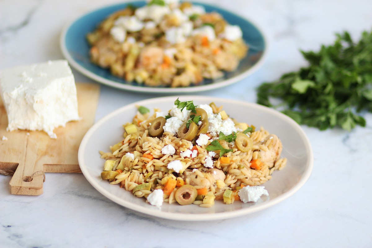 Κριθαράκι με κοτόπουλο, λαχανικά και ανθότυρο