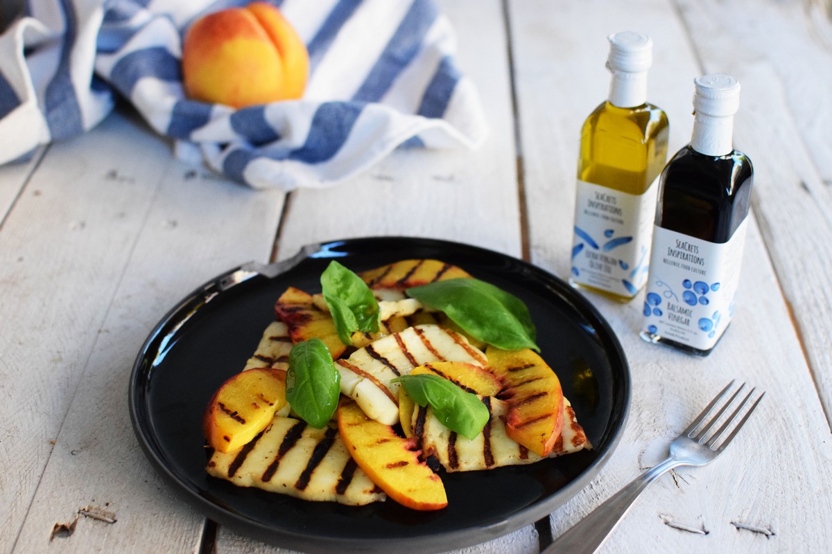 Τη θέση της μοτσαρέλας και της ντομάτας παίρνει το κυπριακό χαλούμι και το ζουμερό ροδάκινο με φόντο το έξτρα παρθένο ελαιόλαδο από την Καλαμάτα και ξύδι βαλσάμικο.