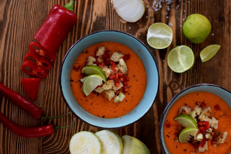 Καλοκαιρινή κρύα σούπα από το Μεξικό, με βάση τη τομάτα, σώμα από ψωμί και υπέροχες ισορροπίες ανάμεσα στην οξύτητα που δίνει το λάιμ και τη σπιρτάδα του σκόρδου.