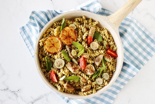 Ένα πιάτο ζυμαρικών είναι πάντα καλοδεχούμενο. Ειδικά, όταν συνοδεύεται με θρεπτικό κοτόπουλο, κολοκυθάκια και πέστο βασιλικού που συντελούν σε μια απολαυστική γευστική συμφωνία.