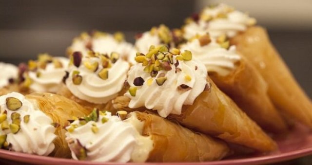 Εννοείται ότι τώρα θα πρέπει να αφαιρέσεις από μέσα τα μπαλάκια και να γεμίσεις τα τρίγωνα με την κρέμα που έφτιαξες, χρησιμοποιώντας μια σακούλα ζαχαροπλαστικής. Όσο για την διακόσμηση τους μπορείς να βάλεις στο τέλος λίγη σαντιγί και τριμμένο φιστίκι.