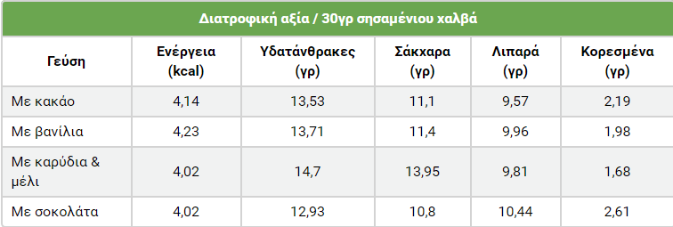 Ο σησαμένιος χαλβάς στην αγορά υπάρχει με μία ευρεία γκάμα γευστικών επιλογών που περιλαμβάνουν χαλβά με κακάο, με βανίλια, με μαστίχα με ξηρούς καρπούς, με σοκολάτα, κ.α. Η διατροφική τους αξία συνοψίζεται στον πίνακα που ακολουθεί: