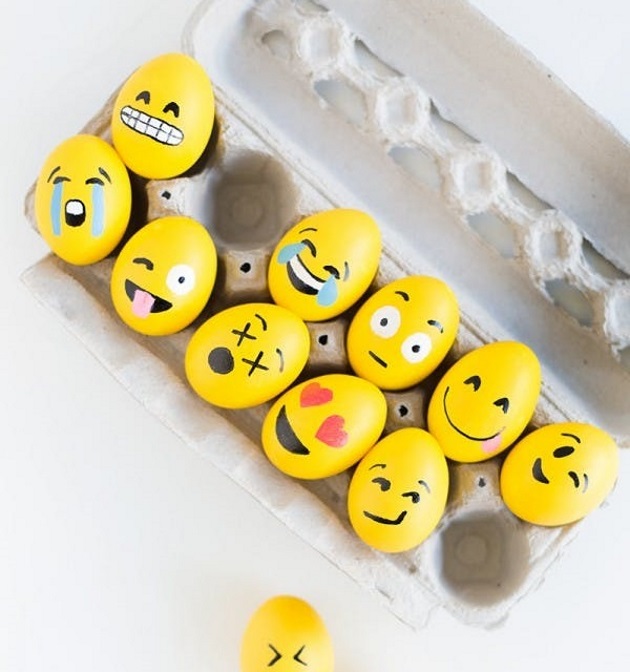 Πέρα από το παραδοσιακό βάψιμο των αυγών, υπάρχουν κι άλλοι τρόποι να διακοσμήσεις τα πασχαλινά αυγά και σίγουρα τα μικρά σου θα το εκτιμήσουν! Φέτος, τα αυγά-emoji είναι πολύ διαδεδομένα -αν και δεν προορίζονται για φαγητό, αλλά μόνο για διακόσμηση. Είναι, μάλιστα, πολύ εύκολο να γίνουν ακόμη και με μαρκαδόρο! Βάψτε τα αυγά σε κίτρινη απόχρωση και έπειτα άφησε τα παιδιά να ζωγραφίσουν πάνω τους γκριμάτσες και διαφορετικές φατσούλες!
