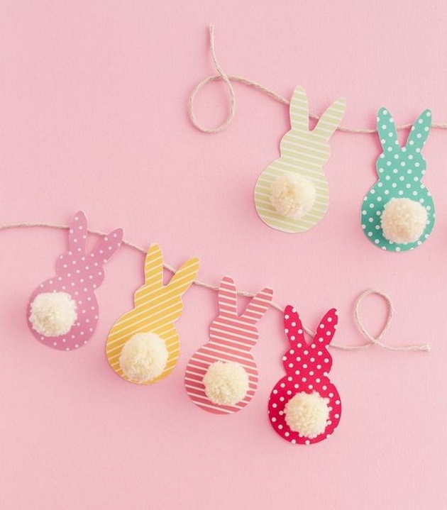 Ένα ακόμη διακοσμητικό που μπορείτε να φτιάξετε για το σπίτι είναι οι πασχαλινές γιρλάντες από χαρτί! Τα μόνα υλικά που θα χρειαστείτε είναι χαρτόνι σε διάφορες αποχρώσεις και patterns, σπάγκος, κόλλα και μερικά πομ πον. Σχεδιάστε το περίγραμμα ενός λαγού στα χαρτόνια και κόψτε με ψαλίδι. Έπειτα κολλήστε τα πομ πον για ουρίτσες και τέλος κολλήστε τα λαγουδάκια πάνω στο σπάγκο. Έτοιμη η γιρλάντα!