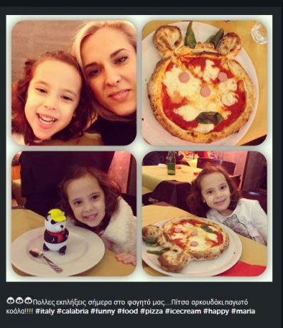 Η Έλενα Ασημακοπούλου ευτυχισμένη με τις ανέμελες και γιορτινές οικογενειακές στιγμές, ανέβασε στον προσωπικό της λογαριασμό στο instagram φωτογραφίες με την κορούλα τους να ετοιμάζεται να φάει πίτσα, ενώ λίγο αργότερα δημοσίευσε και μια τρυφερή φωτογραφία με το σύζυγο της Μπρούνο Τσιρίλο που είναι αγκαλιασμένοι και φιλιούνται κάπου στην Ιταλία...